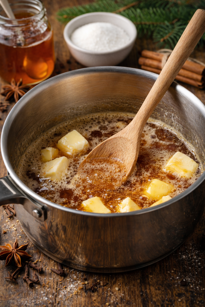 Do garnka włóż miód, cukier oraz masło. Podgrzewaj na małym ogniu, mieszając, aż składniki całkowicie się rozpuszczą i połączą. Odstaw do przestudzenia.